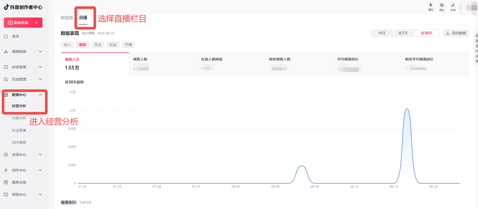 1、电脑登录【抖音创作者中心】https://creator.douyin.com/ 2、点击【数据中心】进入经营分析,选择直播栏目