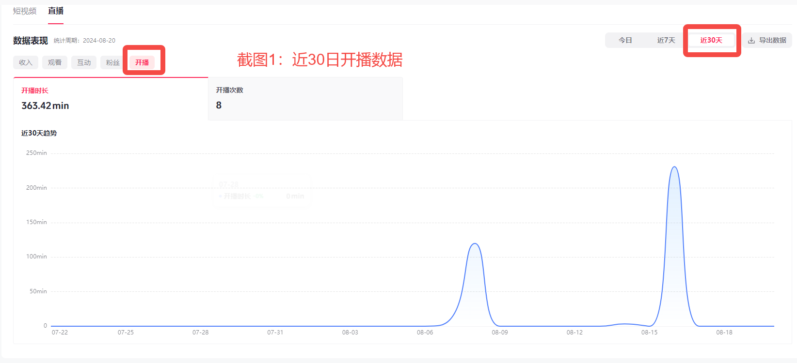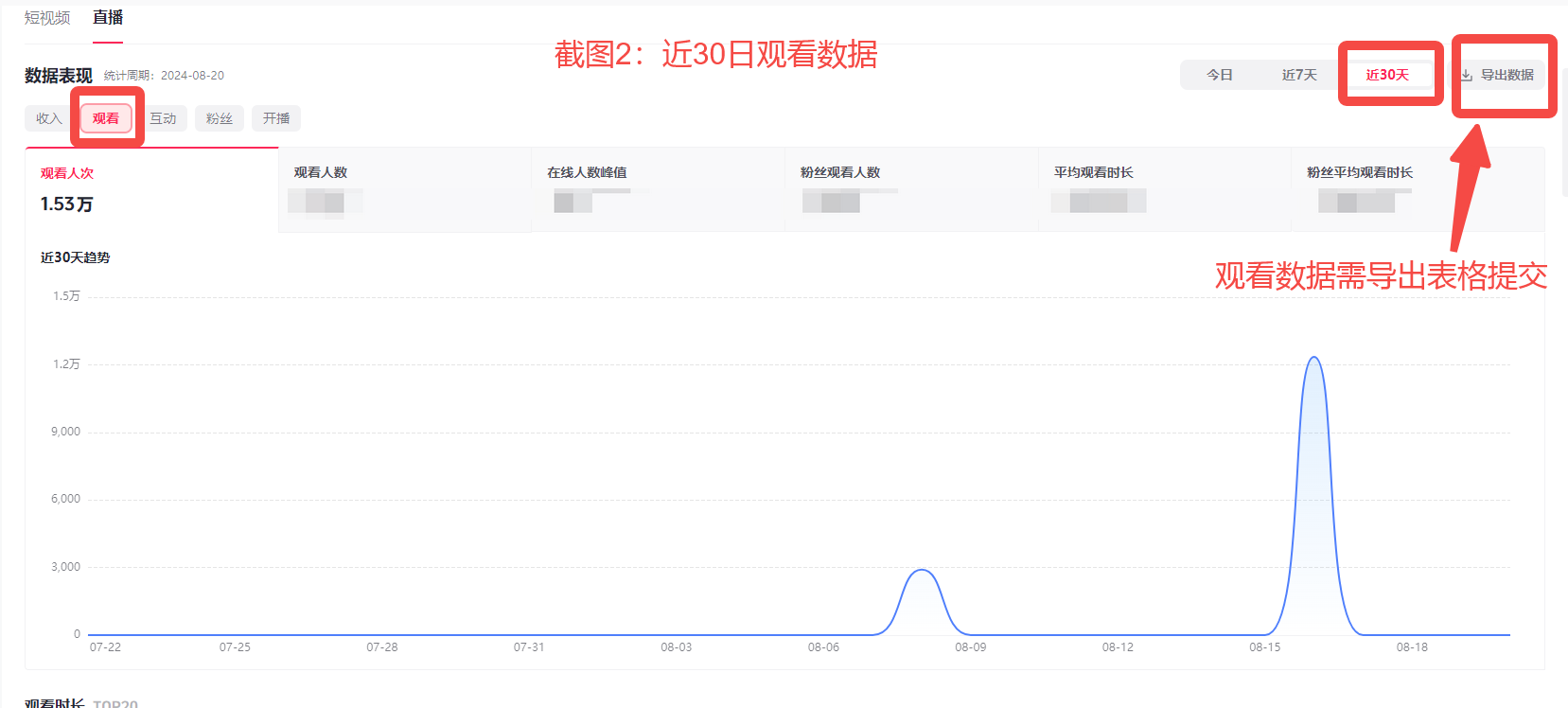 3、时间选择【近30日】,截图【开播】和【观看】数据进行提交,同时观看数据需要导出表格