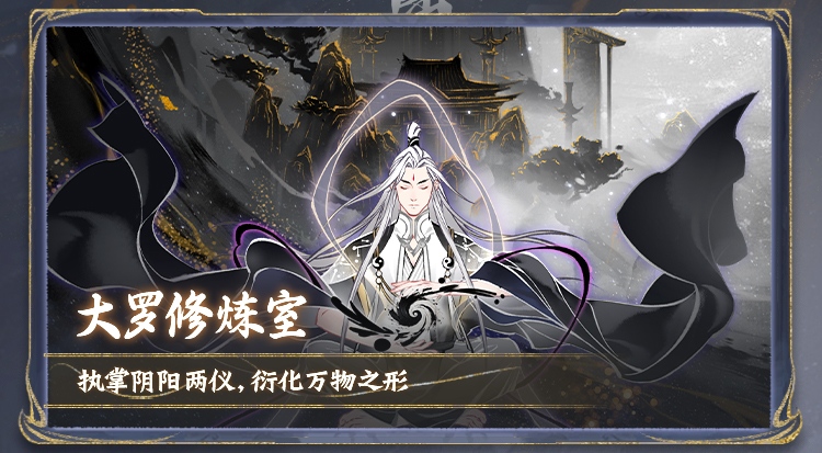 大罗修炼室同步开放,修士跻身大罗后,窥得混沌玄机,执掌阴阳两仪,一呼一吸间,黑白二气携万千星辰徐徐翻转,身后阴阳二气随境界提升显化不同形态,前期化为险峻山岳,中期汇聚于群山之中,后期凝为鎏金仙宫。