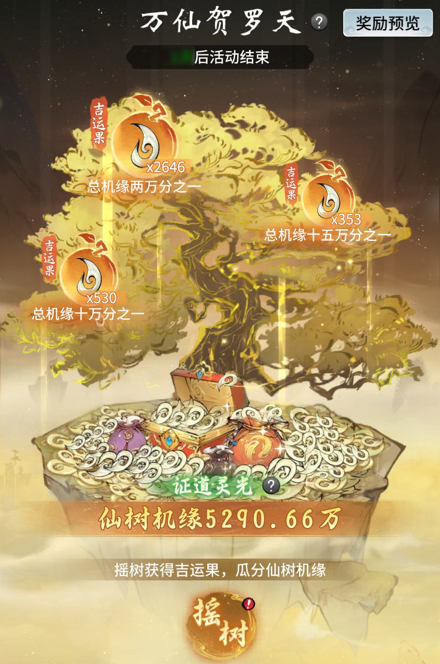 进入瓜分机缘阶段后,玩家可通过每日摇树1次,抽取不同的吉运果,瓜分丰厚机缘奖励。