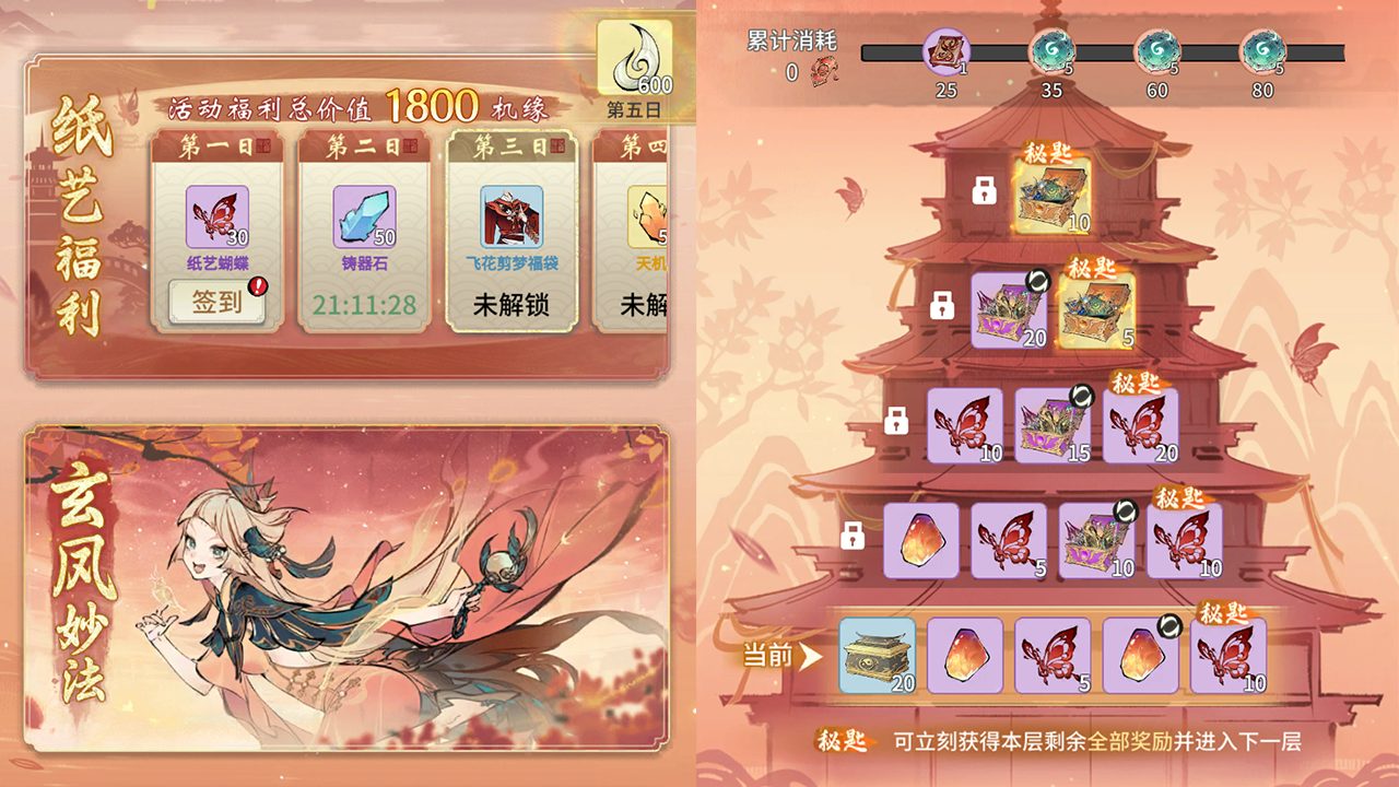 新功法“涅火凤还诀”将随活动一同上线,此乃玄凤一族秘法,向死而生,涅火凤还。玩家修习后可获得会心格挡等属性加成,活动期间将该功法修炼至指定层数,还可领取玄凤赠与的机缘与限时道号奖励。