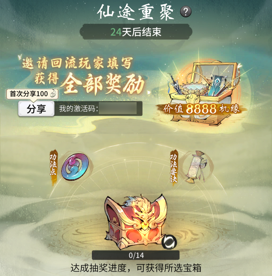 活动将于4月24日起开启,持续25天元婴对应境界及以上仙友可参与仙友每日登录可获得1次抽奖机会累计抽取14次可获得最终大奖邀请回归仙友填写激活码可直接领取奖励